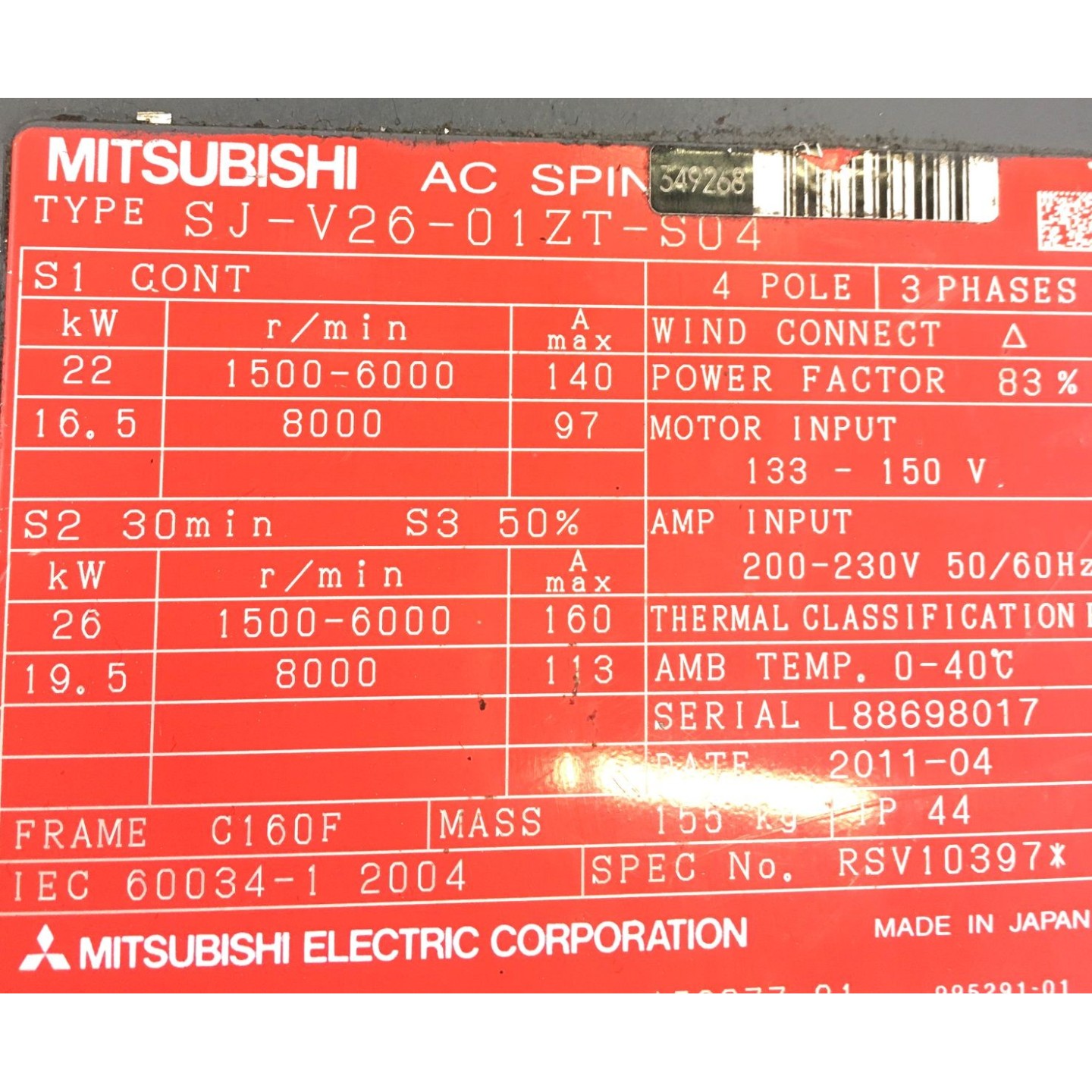Motor de eje MITSUBISHI SJ-V26-01ZT-S04 26kW