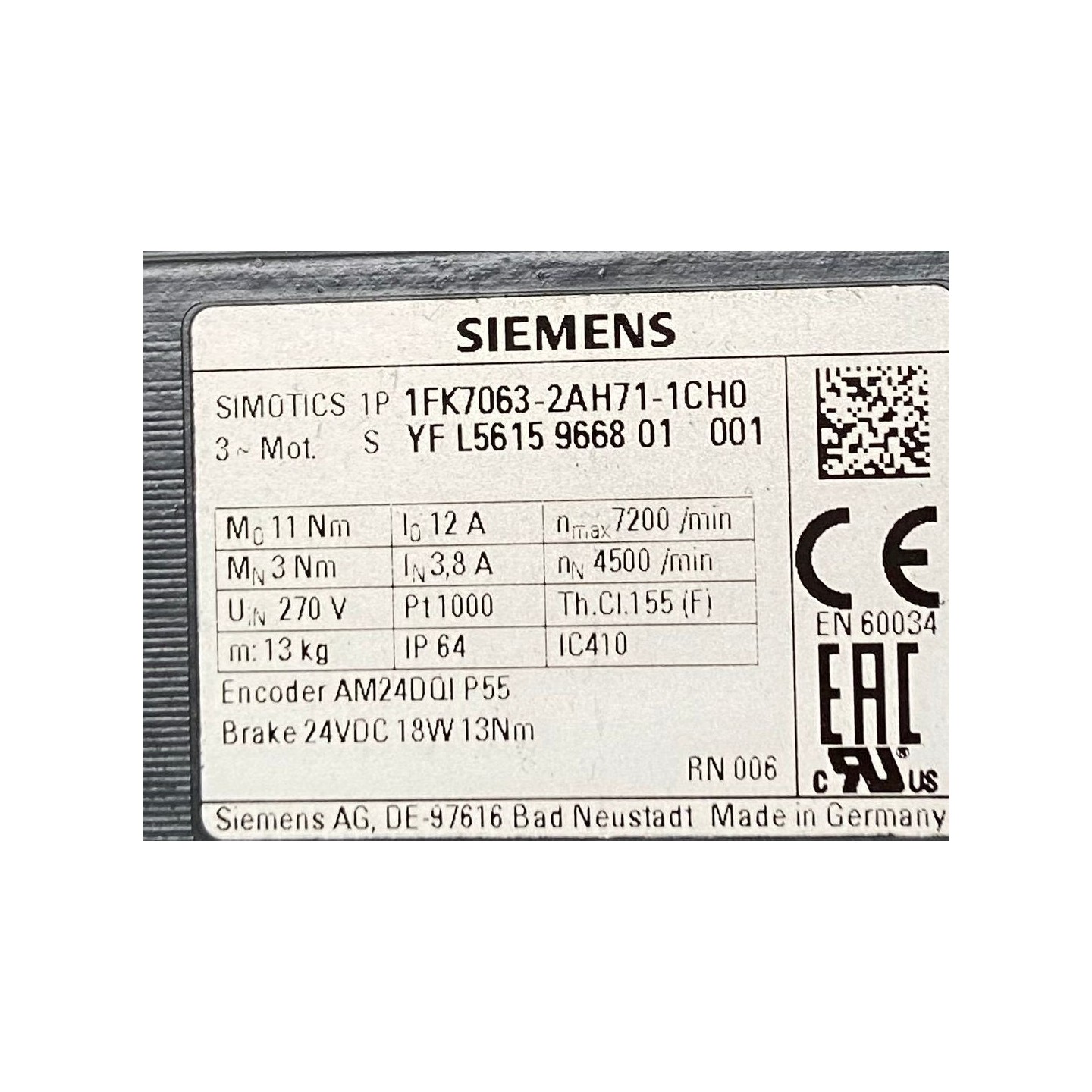 Moteur SIMOTICS 1P SIEMENS 1FK7063-2AH71-1CH0